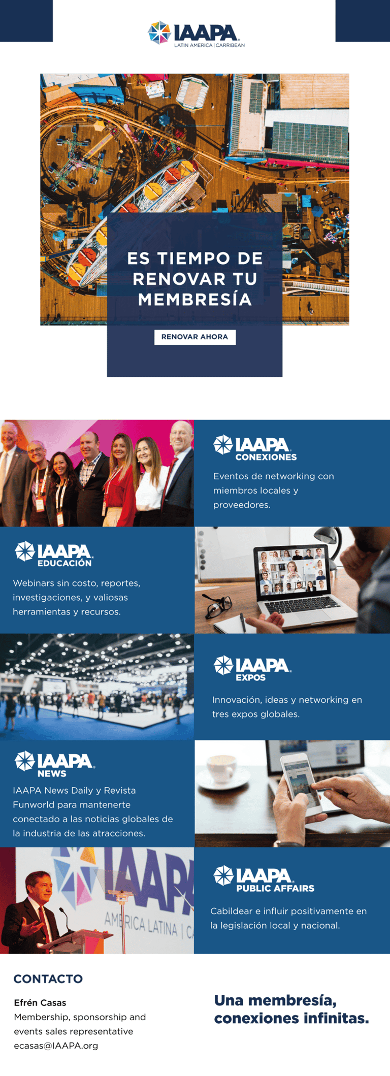 I created visually appealing and informative brochures to promote IAAPA’s events and membership offerings, ensuring they effectively communicated the value and benefits to the Latin American audience.